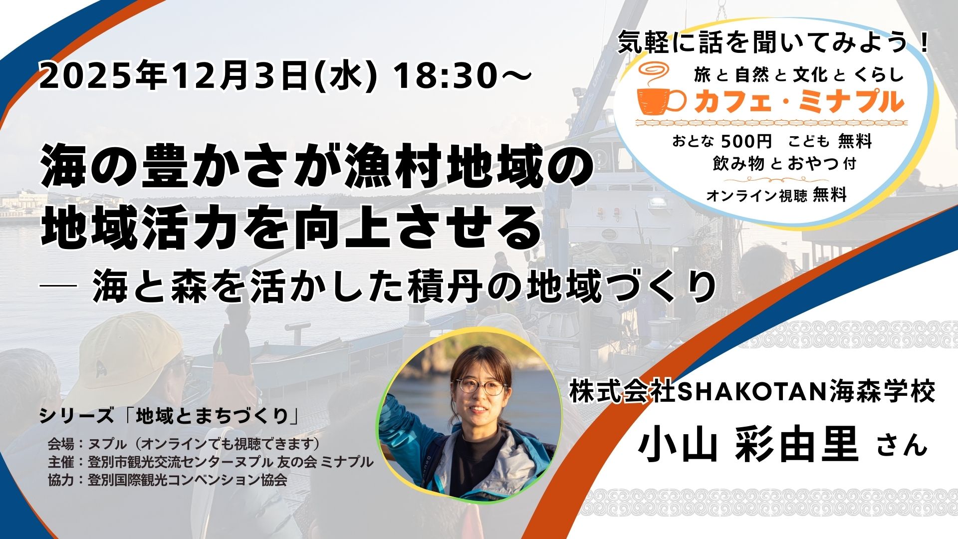 カフェ・ミナプルは「旅」「文化」「自然」「くらし」をキーワードに、これからの町づくりについて考えるトークイベントです。話してくれるのは、それぞれの分野で濃い(ヌプㇽ)活動をしている「ヌプㇽさん」。 夕方のひとときを、講師の話を聞きながら、一緒にヌプㇽで過ごしませんか?