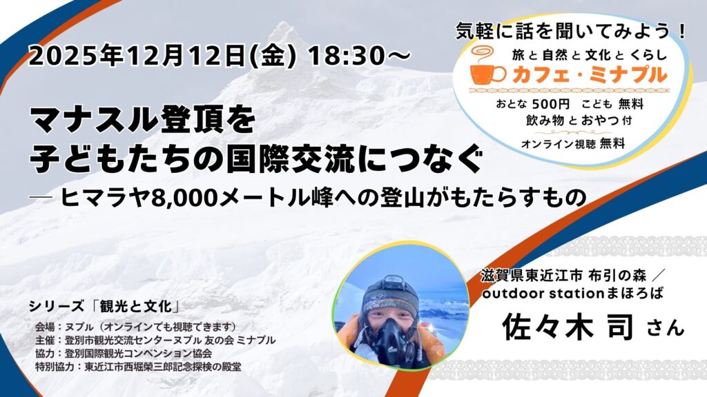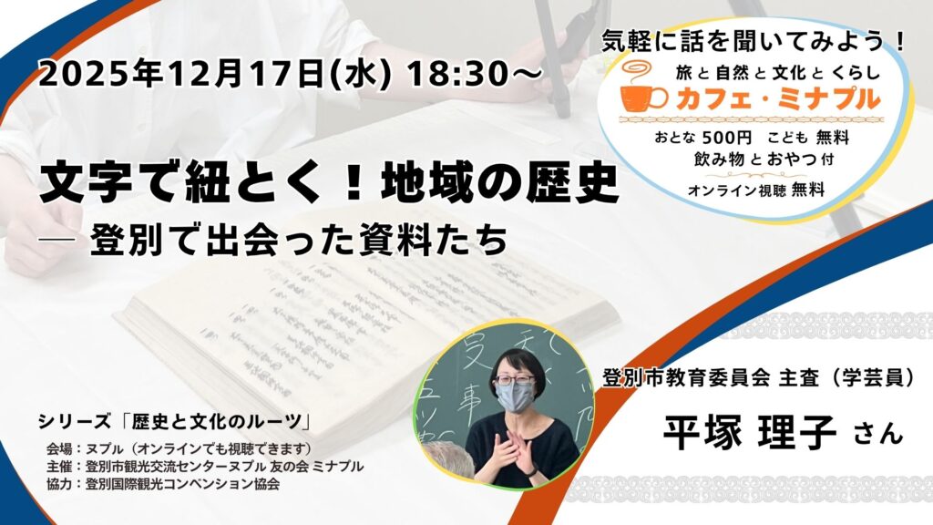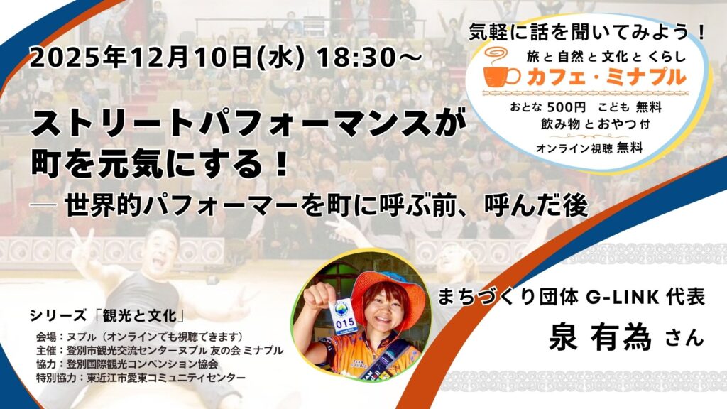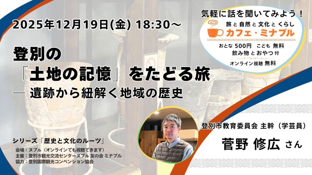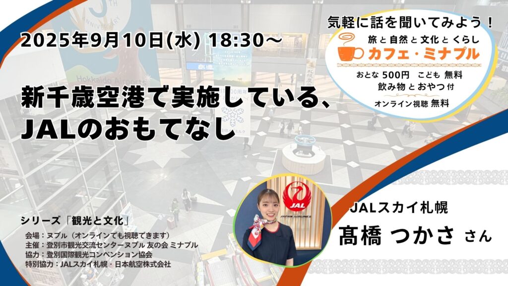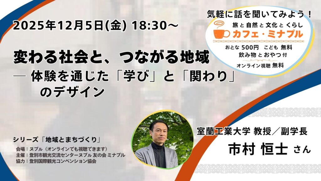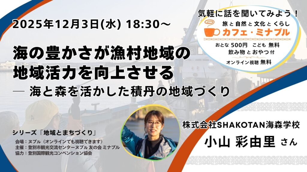 カフェ・ミナプルは「旅」「文化」「自然」「くらし」をキーワードに、これからの町づくりについて考えるトークイベントです。話してくれるのは、それぞれの分野で [濃い(ヌプㇽ)] 活動をしている「ヌプㇽさん」。 夕方のひとときを、講師の話を聞きながら、一緒にヌプㇽで過ごしませんか?